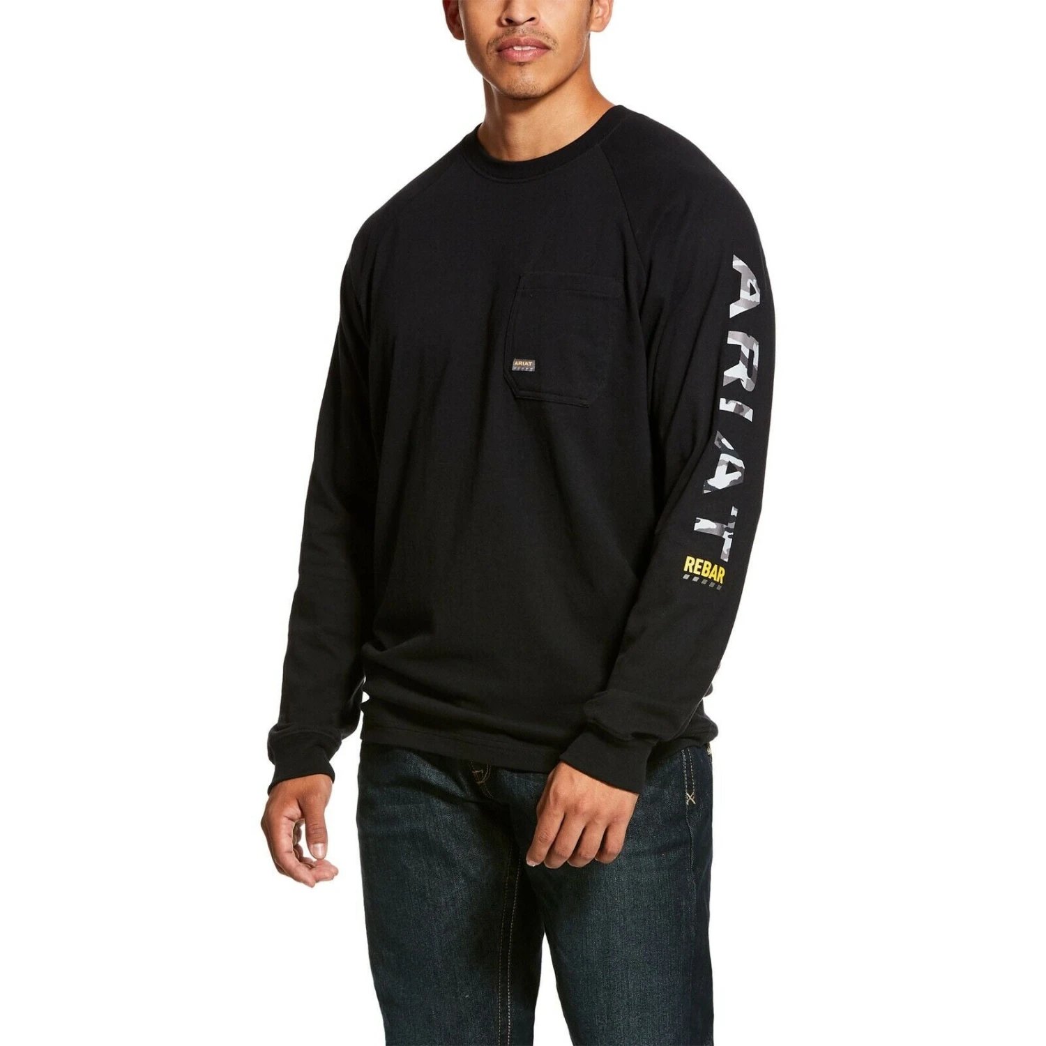 - Camo screen print sleeve logo.
